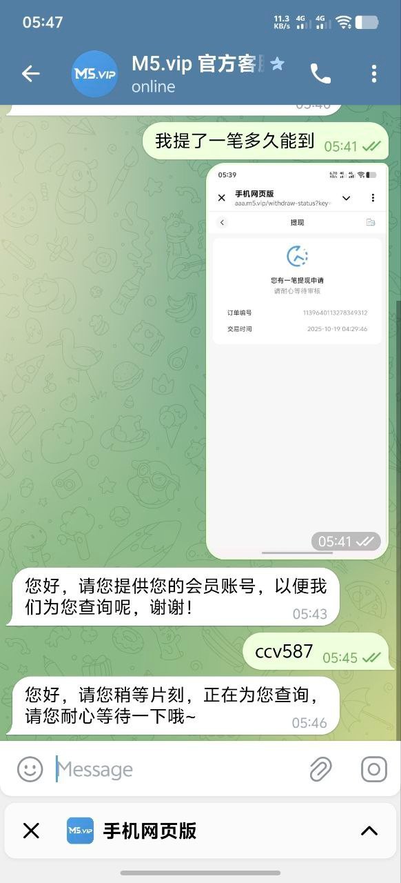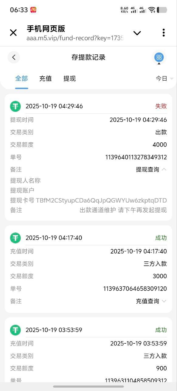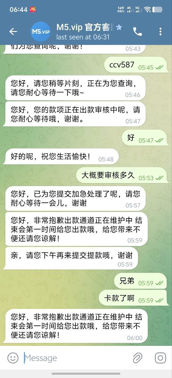 大家避雷了兄弟们,这个台子是黑平台,兴趣缺缺,一时兴起就玩了一下这个平台,没想到,赢到了五千 u 提个四千 u 就被卡了。找他们客服就说是维护,充的时候怎么不维护,叫我下午提款,然后呢,又是什么理由,受害者就是频道主,频道主亲测有效,妥妥的黑平台,说维护的时候已经又用 1000u 干到了一万多 u,屌不屌兄弟们,干到一万多 u 才去找的客服,妥妥的杀猪了兄弟们,充了四千多给你妈生孩子吧。 避雷 兄弟们现在新台很多避雷了,小心这种杀猪台子。